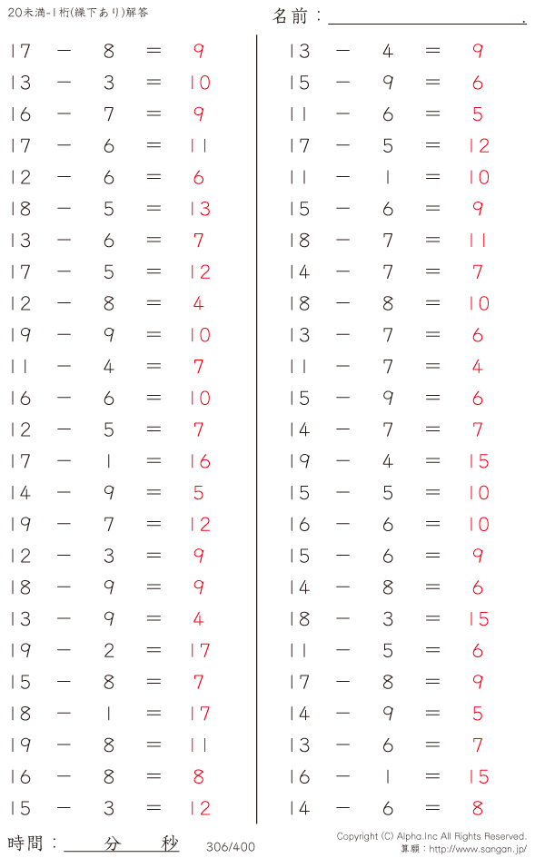 上記のボタンから「20未満の2桁-1桁」の算数数学ドリル・計算ドリル(PDFプリント)がダウンロードできます。個人利用は無料です(家庭以外での配布は有料です)。