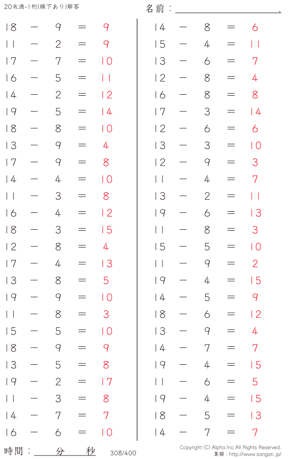 上記のボタンから「20未満の2桁-1桁」の算数数学ドリル・計算ドリル(PDFプリント)がダウンロードできます。個人利用は無料です(家庭以外での配布は有料です)。