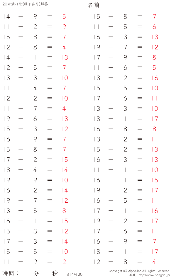 上記のボタンから「20未満の2桁-1桁」の算数数学ドリル・計算ドリル(PDFプリント)がダウンロードできます。個人利用は無料です(家庭以外での配布は有料です)。