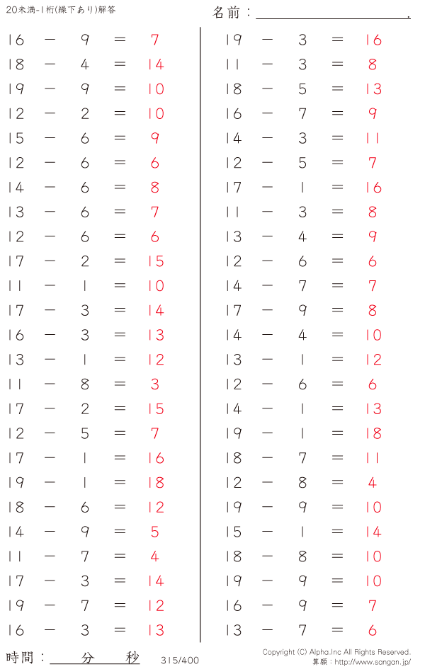 上記のボタンから「20未満の2桁-1桁」の算数数学ドリル・計算ドリル(PDFプリント)がダウンロードできます。個人利用は無料です(家庭以外での配布は有料です)。