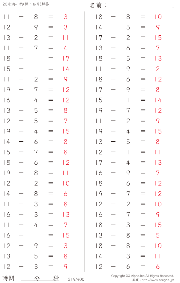 上記のボタンから「20未満の2桁-1桁」の算数数学ドリル・計算ドリル(PDFプリント)がダウンロードできます。個人利用は無料です(家庭以外での配布は有料です)。