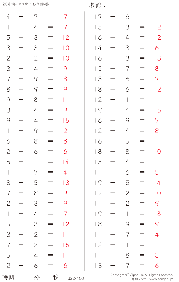 上記のボタンから「20未満の2桁-1桁」の算数数学ドリル・計算ドリル(PDFプリント)がダウンロードできます。個人利用は無料です(家庭以外での配布は有料です)。