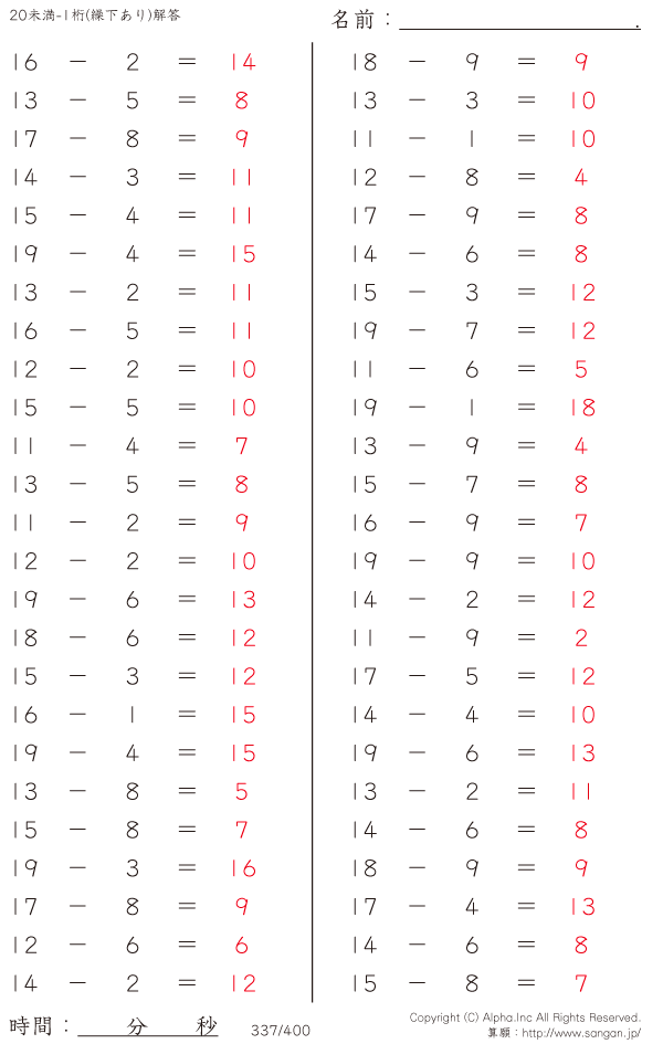 上記のボタンから「20未満の2桁-1桁」の算数数学ドリル・計算ドリル(PDFプリント)がダウンロードできます。個人利用は無料です(家庭以外での配布は有料です)。