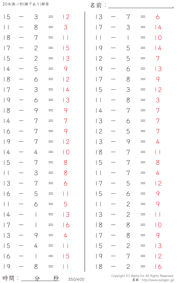 上記のボタンから「20未満の2桁-1桁」の算数数学ドリル・計算ドリル(PDFプリント)がダウンロードできます。個人利用は無料です(家庭以外での配布は有料です)。