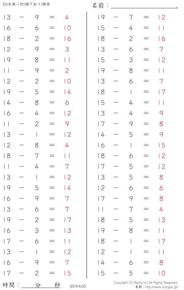 上記のボタンから「20未満の2桁-1桁」の算数数学ドリル・計算ドリル(PDFプリント)がダウンロードできます。個人利用は無料です(家庭以外での配布は有料です)。