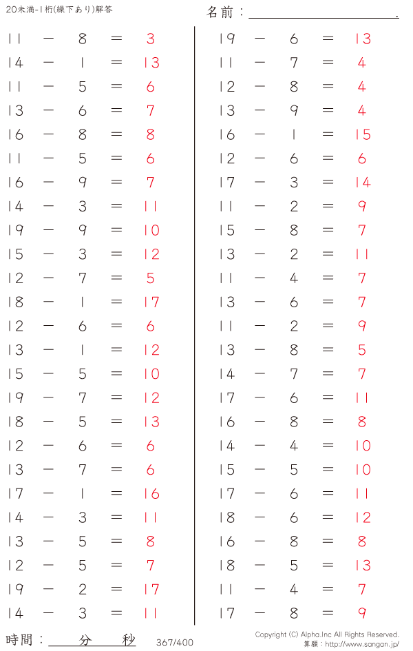 上記のボタンから「20未満の2桁-1桁」の算数数学ドリル・計算ドリル(PDFプリント)がダウンロードできます。個人利用は無料です(家庭以外での配布は有料です)。