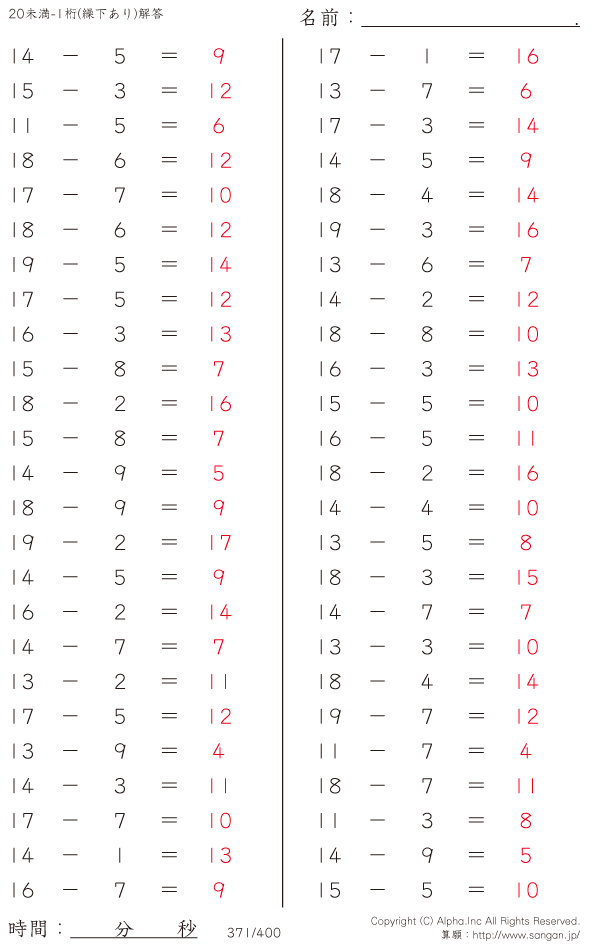 上記のボタンから「20未満の2桁-1桁」の算数数学ドリル・計算ドリル(PDFプリント)がダウンロードできます。個人利用は無料です(家庭以外での配布は有料です)。