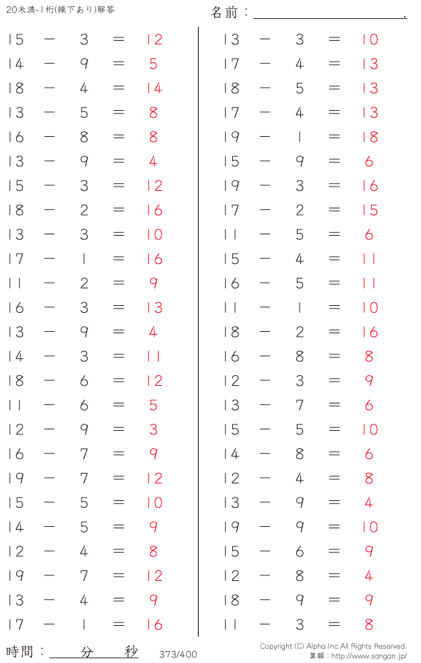 上記のボタンから「20未満の2桁-1桁」の算数数学ドリル・計算ドリル(PDFプリント)がダウンロードできます。個人利用は無料です(家庭以外での配布は有料です)。