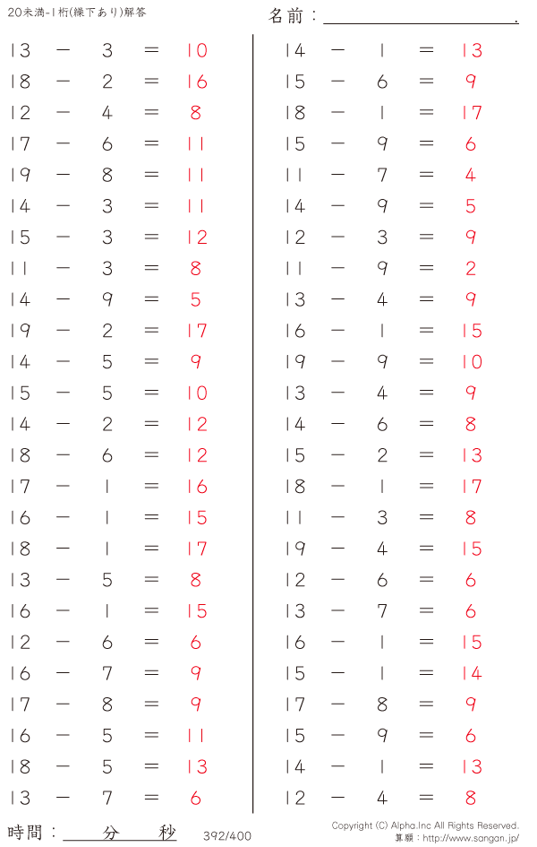 20未満の2桁-1桁 [解答]392/400