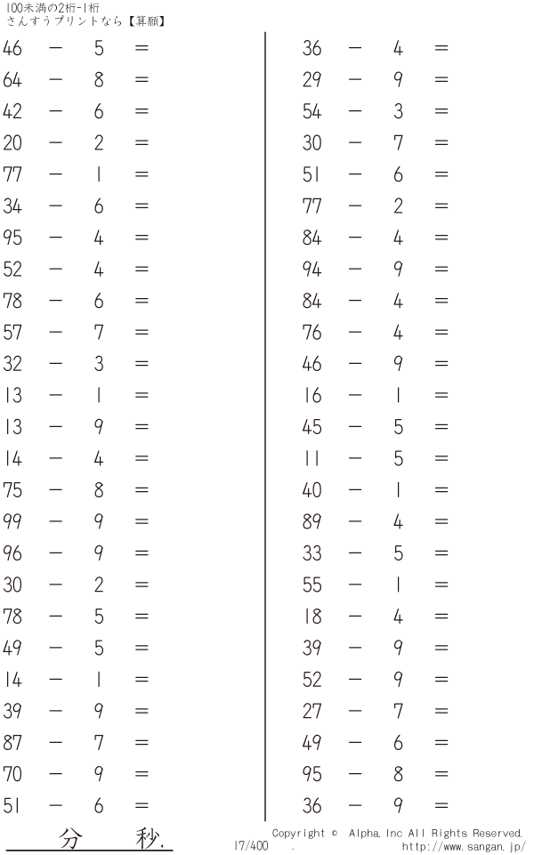 上記のボタンから「100未満の2桁-1桁」の算数数学ドリル・計算ドリル(PDFプリント)がダウンロードできます。個人利用は無料です(家庭以外での配布は有料です)。