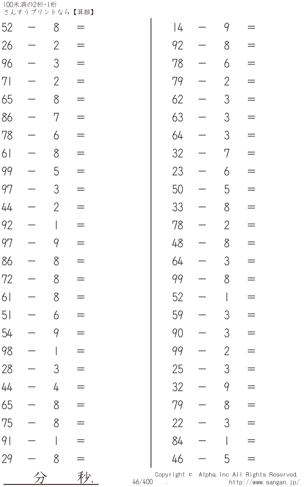 上記のボタンから「100未満の2桁-1桁」の算数数学ドリル・計算ドリル(PDFプリント)がダウンロードできます。個人利用は無料です(家庭以外での配布は有料です)。