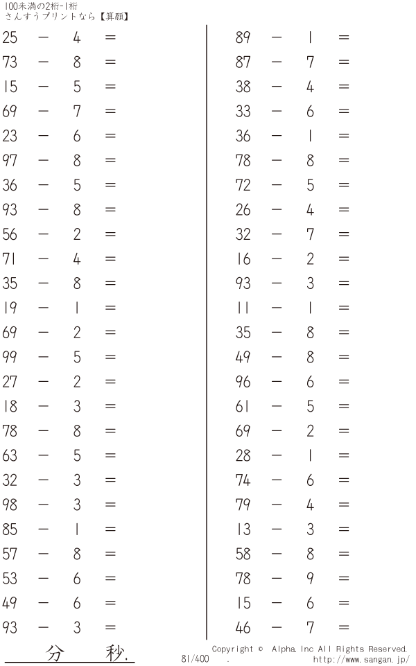 上記のボタンから「100未満の2桁-1桁」の算数数学ドリル・計算ドリル(PDFプリント)がダウンロードできます。個人利用は無料です(家庭以外での配布は有料です)。