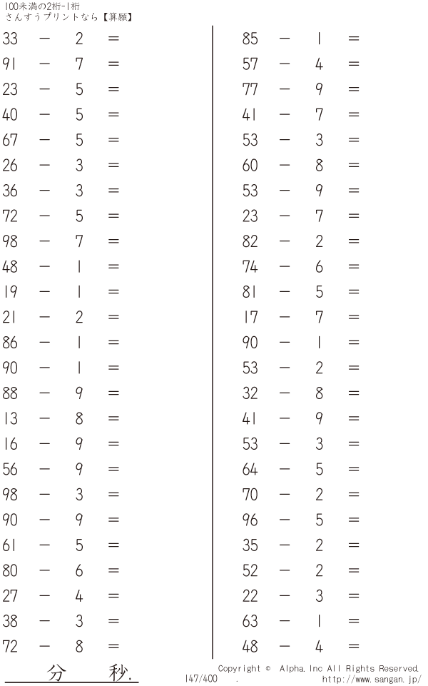 上記のボタンから「100未満の2桁-1桁」の算数数学ドリル・計算ドリル(PDFプリント)がダウンロードできます。個人利用は無料です(家庭以外での配布は有料です)。