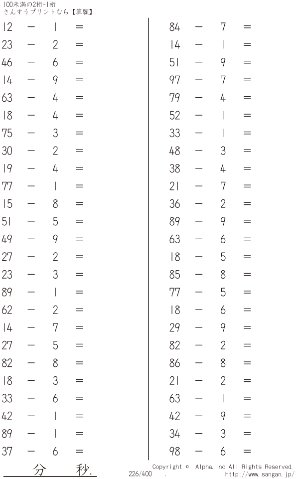 上記のボタンから「100未満の2桁-1桁」の算数数学ドリル・計算ドリル(PDFプリント)がダウンロードできます。個人利用は無料です(家庭以外での配布は有料です)。