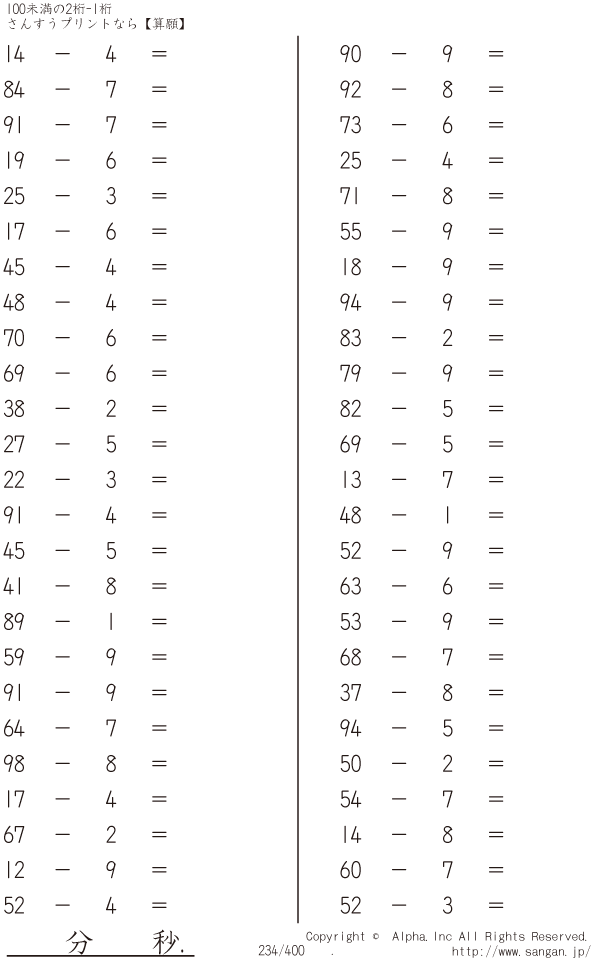 上記のボタンから「100未満の2桁-1桁」の算数数学ドリル・計算ドリル(PDFプリント)がダウンロードできます。個人利用は無料です(家庭以外での配布は有料です)。