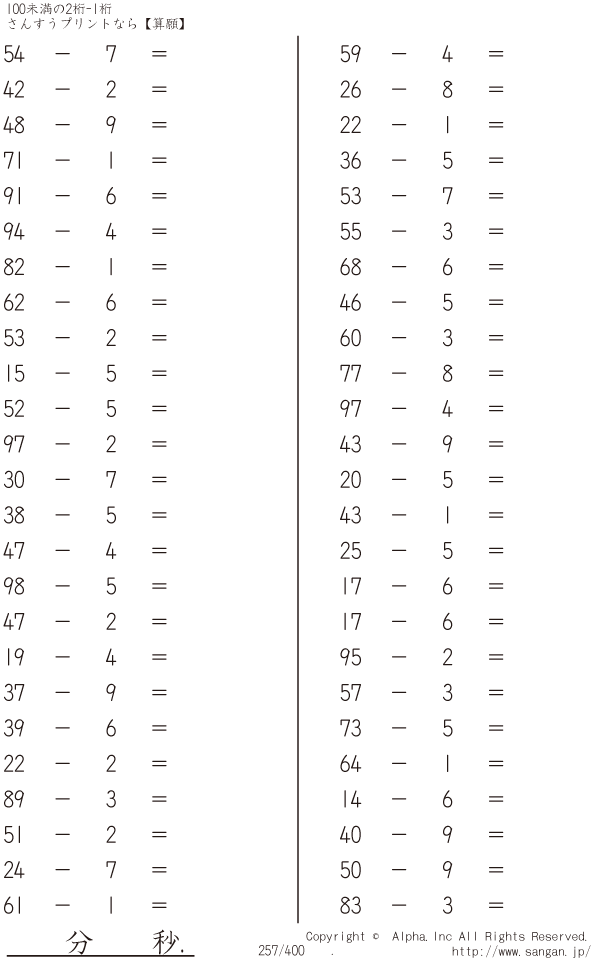 上記のボタンから「100未満の2桁-1桁」の算数数学ドリル・計算ドリル(PDFプリント)がダウンロードできます。個人利用は無料です(家庭以外での配布は有料です)。