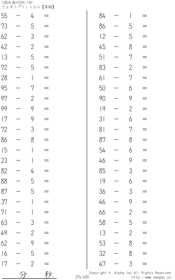 上記のボタンから「100未満の2桁-1桁」の算数数学ドリル・計算ドリル(PDFプリント)がダウンロードできます。個人利用は無料です(家庭以外での配布は有料です)。