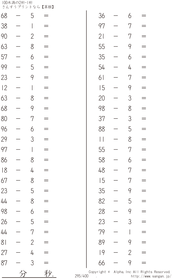 上記のボタンから「100未満の2桁-1桁」の算数数学ドリル・計算ドリル(PDFプリント)がダウンロードできます。個人利用は無料です(家庭以外での配布は有料です)。
