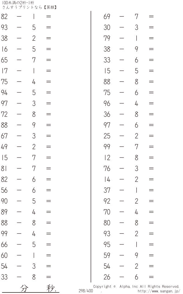 上記のボタンから「100未満の2桁-1桁」の算数数学ドリル・計算ドリル(PDFプリント)がダウンロードできます。個人利用は無料です(家庭以外での配布は有料です)。