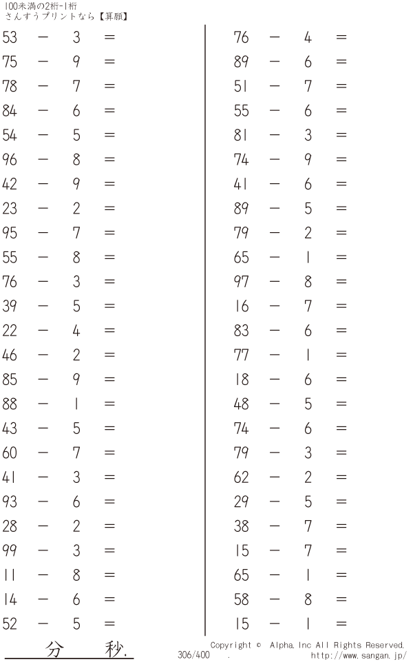 上記のボタンから「100未満の2桁-1桁」の算数数学ドリル・計算ドリル(PDFプリント)がダウンロードできます。個人利用は無料です(家庭以外での配布は有料です)。