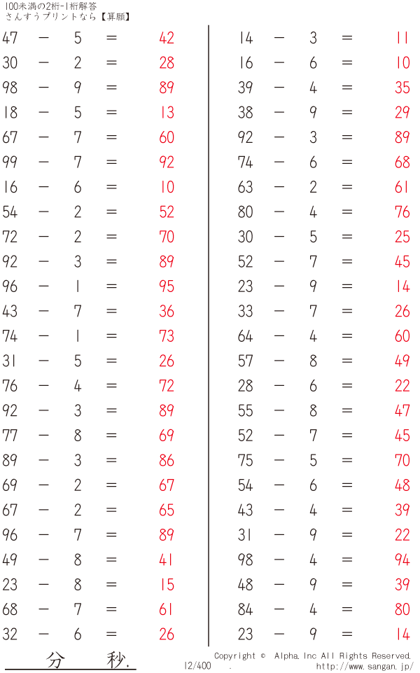上記のボタンから「100未満の2桁-1桁」の算数数学ドリル・計算ドリル(PDFプリント)がダウンロードできます。個人利用は無料です(家庭以外での配布は有料です)。