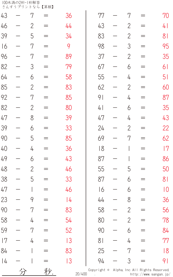 上記のボタンから「100未満の2桁-1桁」の算数数学ドリル・計算ドリル(PDFプリント)がダウンロードできます。個人利用は無料です(家庭以外での配布は有料です)。