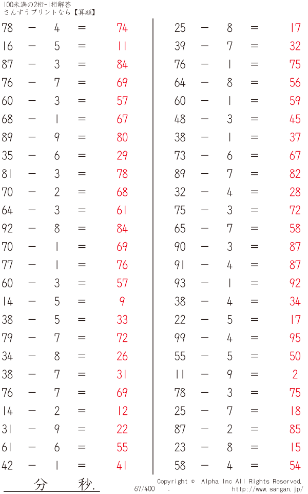 上記のボタンから「100未満の2桁-1桁」の算数数学ドリル・計算ドリル(PDFプリント)がダウンロードできます。個人利用は無料です(家庭以外での配布は有料です)。