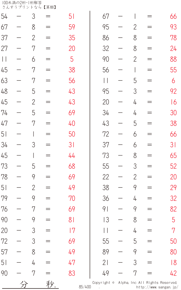 上記のボタンから「100未満の2桁-1桁」の算数数学ドリル・計算ドリル(PDFプリント)がダウンロードできます。個人利用は無料です(家庭以外での配布は有料です)。