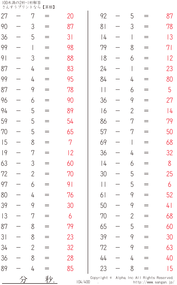 上記のボタンから「100未満の2桁-1桁」の算数数学ドリル・計算ドリル(PDFプリント)がダウンロードできます。個人利用は無料です(家庭以外での配布は有料です)。