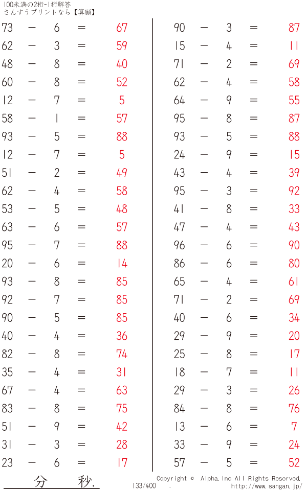 上記のボタンから「100未満の2桁-1桁」の算数数学ドリル・計算ドリル(PDFプリント)がダウンロードできます。個人利用は無料です(家庭以外での配布は有料です)。