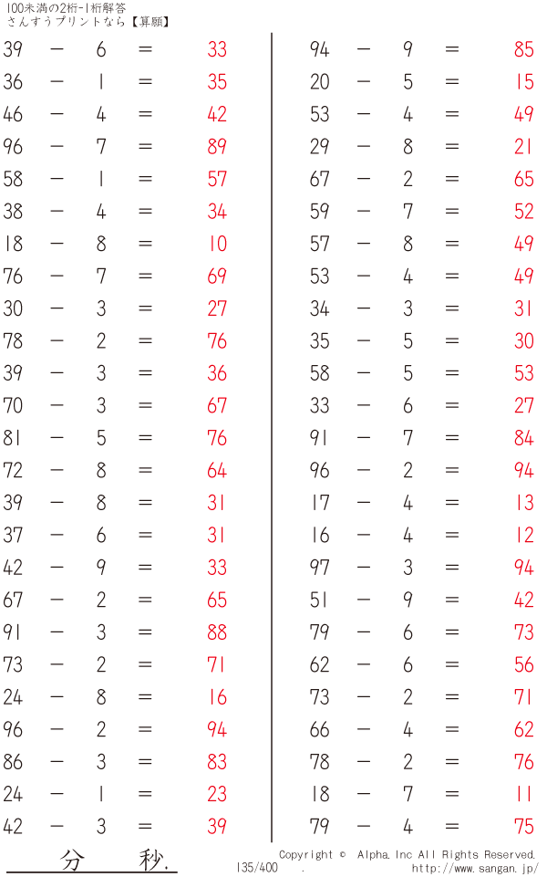 上記のボタンから「100未満の2桁-1桁」の算数数学ドリル・計算ドリル(PDFプリント)がダウンロードできます。個人利用は無料です(家庭以外での配布は有料です)。