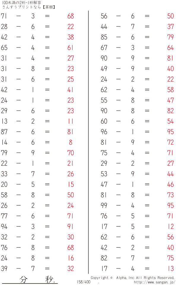 上記のボタンから「100未満の2桁-1桁」の算数数学ドリル・計算ドリル(PDFプリント)がダウンロードできます。個人利用は無料です(家庭以外での配布は有料です)。
