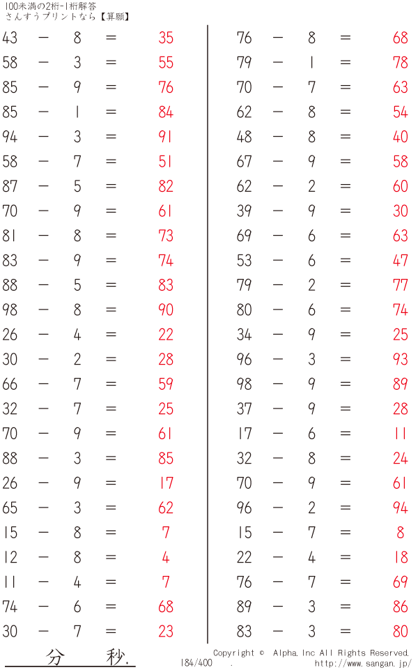 上記のボタンから「100未満の2桁-1桁」の算数数学ドリル・計算ドリル(PDFプリント)がダウンロードできます。個人利用は無料です(家庭以外での配布は有料です)。