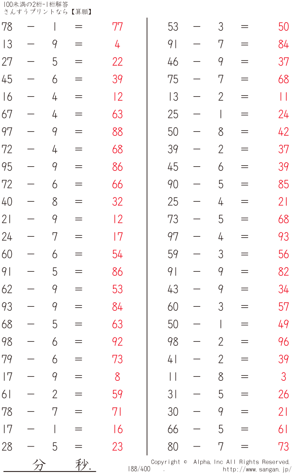 上記のボタンから「100未満の2桁-1桁」の算数数学ドリル・計算ドリル(PDFプリント)がダウンロードできます。個人利用は無料です(家庭以外での配布は有料です)。
