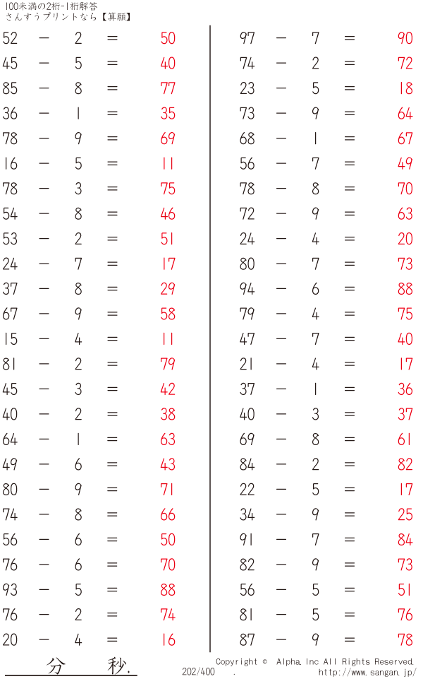 上記のボタンから「100未満の2桁-1桁」の算数数学ドリル・計算ドリル(PDFプリント)がダウンロードできます。個人利用は無料です(家庭以外での配布は有料です)。