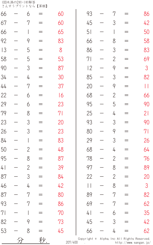 上記のボタンから「100未満の2桁-1桁」の算数数学ドリル・計算ドリル(PDFプリント)がダウンロードできます。個人利用は無料です(家庭以外での配布は有料です)。