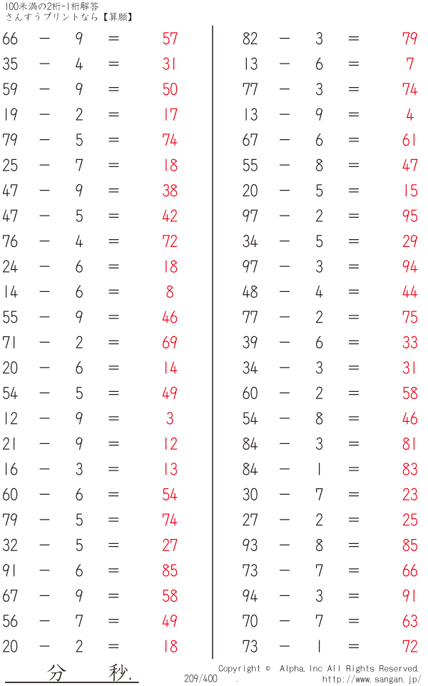上記のボタンから「100未満の2桁-1桁」の算数数学ドリル・計算ドリル(PDFプリント)がダウンロードできます。個人利用は無料です(家庭以外での配布は有料です)。
