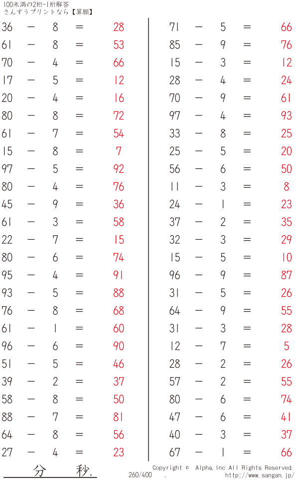 上記のボタンから「100未満の2桁-1桁」の算数数学ドリル・計算ドリル(PDFプリント)がダウンロードできます。個人利用は無料です(家庭以外での配布は有料です)。