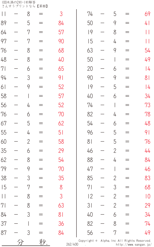 上記のボタンから「100未満の2桁-1桁」の算数数学ドリル・計算ドリル(PDFプリント)がダウンロードできます。個人利用は無料です(家庭以外での配布は有料です)。