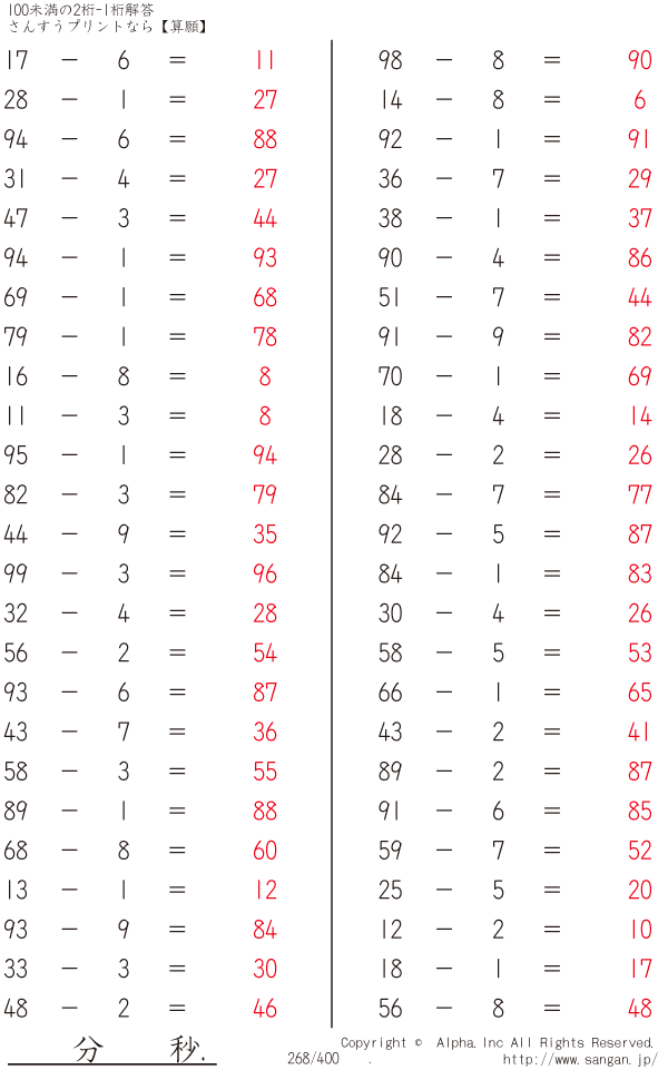 上記のボタンから「100未満の2桁-1桁」の算数数学ドリル・計算ドリル(PDFプリント)がダウンロードできます。個人利用は無料です(家庭以外での配布は有料です)。
