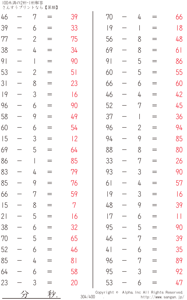 上記のボタンから「100未満の2桁-1桁」の算数数学ドリル・計算ドリル(PDFプリント)がダウンロードできます。個人利用は無料です(家庭以外での配布は有料です)。