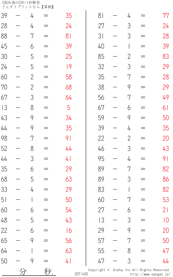 上記のボタンから「100未満の2桁-1桁」の算数数学ドリル・計算ドリル(PDFプリント)がダウンロードできます。個人利用は無料です(家庭以外での配布は有料です)。