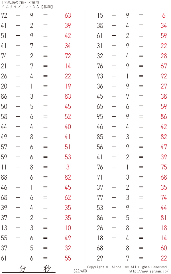 上記のボタンから「100未満の2桁-1桁」の算数数学ドリル・計算ドリル(PDFプリント)がダウンロードできます。個人利用は無料です(家庭以外での配布は有料です)。