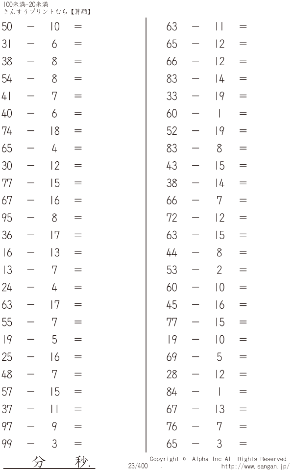 上記のボタンから「100未満-20未満」の算数数学ドリル・計算ドリル(PDFプリント)がダウンロードできます。個人利用は無料です(家庭以外での配布は有料です)。