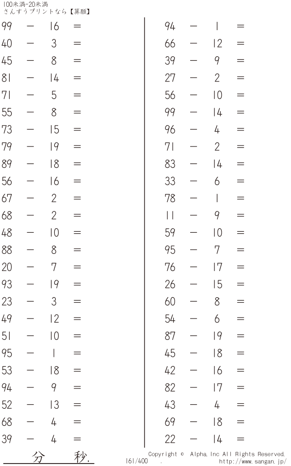 上記のボタンから「100未満-20未満」の算数数学ドリル・計算ドリル(PDFプリント)がダウンロードできます。個人利用は無料です(家庭以外での配布は有料です)。