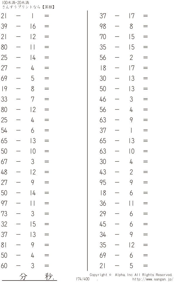 上記のボタンから「100未満-20未満」の算数数学ドリル・計算ドリル(PDFプリント)がダウンロードできます。個人利用は無料です(家庭以外での配布は有料です)。