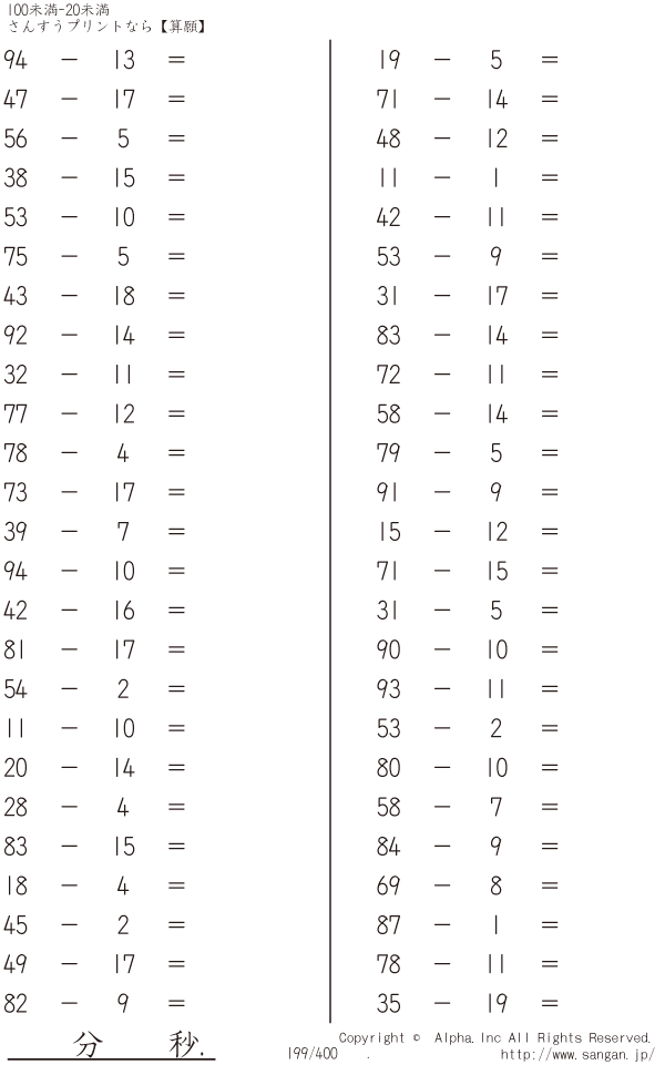 上記のボタンから「100未満-20未満」の算数数学ドリル・計算ドリル(PDFプリント)がダウンロードできます。個人利用は無料です(家庭以外での配布は有料です)。