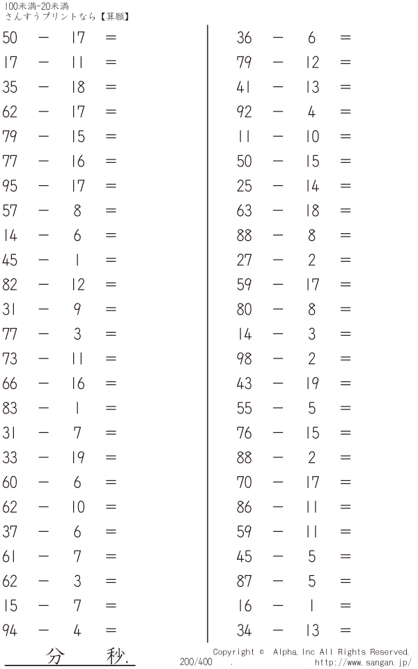 上記のボタンから「100未満-20未満」の算数数学ドリル・計算ドリル(PDFプリント)がダウンロードできます。個人利用は無料です(家庭以外での配布は有料です)。