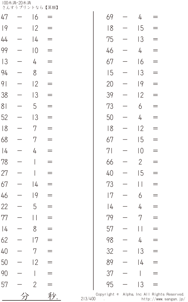 上記のボタンから「100未満-20未満」の算数数学ドリル・計算ドリル(PDFプリント)がダウンロードできます。個人利用は無料です(家庭以外での配布は有料です)。