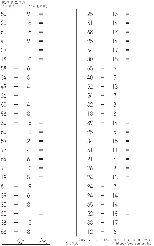 上記のボタンから「100未満-20未満」の算数数学ドリル・計算ドリル(PDFプリント)がダウンロードできます。個人利用は無料です(家庭以外での配布は有料です)。